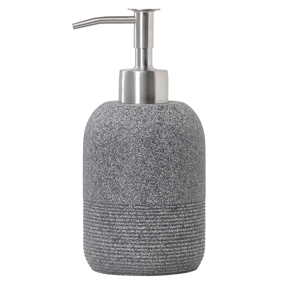 Диспенсер для жидкого мыла Loup имеет корпус из полирезина, стилизованного под натуральный камень графитового оттенка.