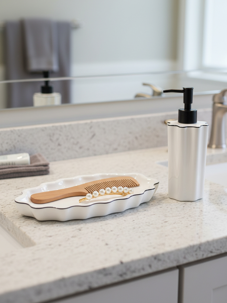 На подставке для ванных принадлежностей удобно разместятся стакан для зубных щеток и диспенсер для жидкого мыла или банка для хранения из коллекции Camellia. Это позволит разумно организовать пространство и объединить аксессуары в гармоничную композицию.