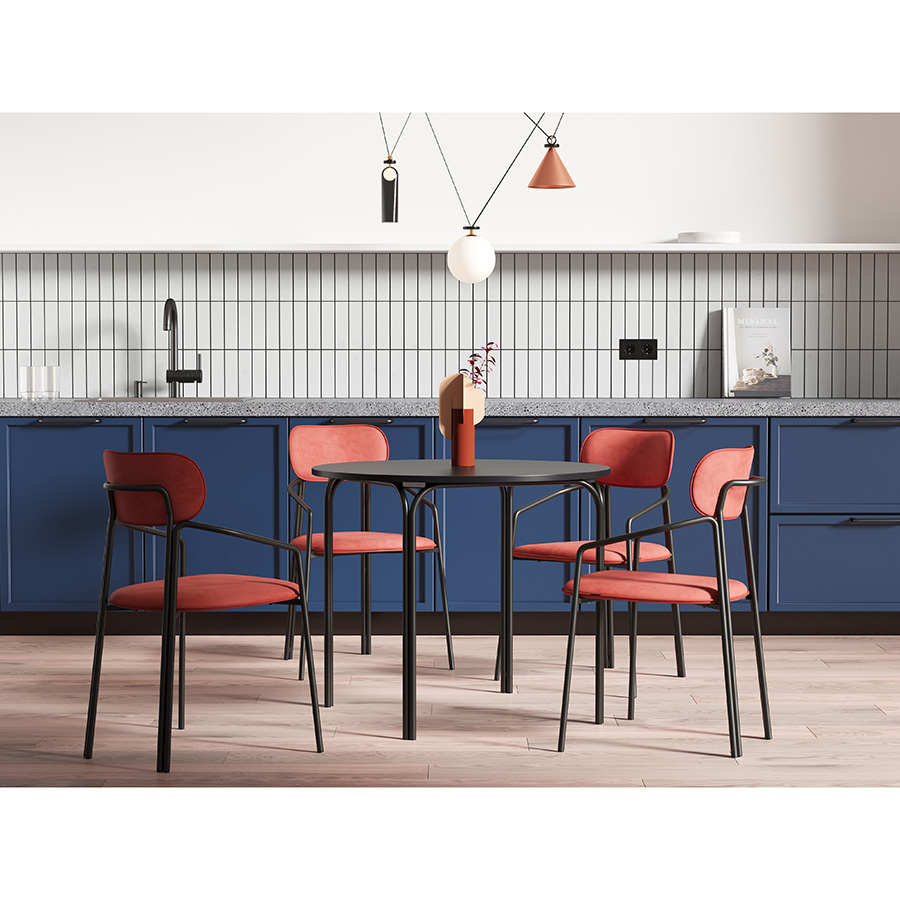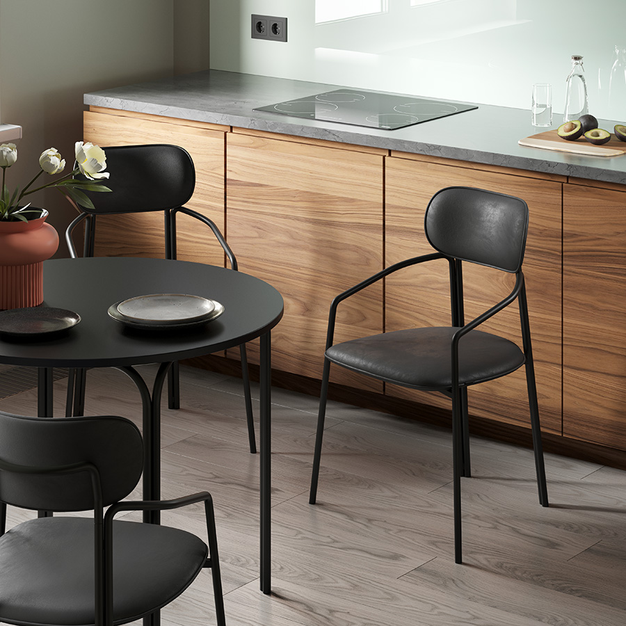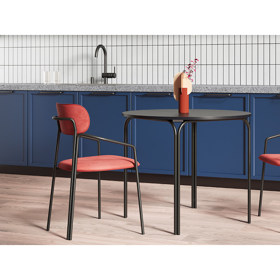 Стол обеденный имеет прочный стальной каркас с порошковым покрытием, что делает его надежным и долговечным. Столешница из ламинированной МДФ отличается повышенной устойчивостью к царапинам, легко моется и не впитывает грязь. Прекрасные эксплуатационные характеристики позволяют использовать мебель не только в домашних условиях, но и для обустройства коммерческих пространств. Все материалы отвечают высоким стандартам практичности и экологической безопасности. Модель с круглой столешницей дает возможность экономить полезную площадь и при необходимости разместить большее количество стульев.